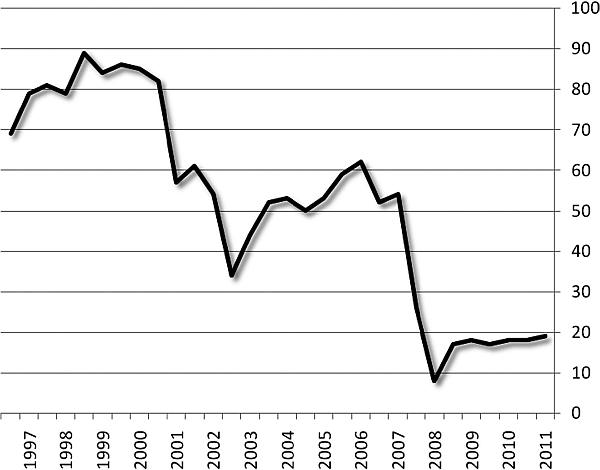 Как видно из графика, начиная с пика 2000 года, количество американцев, позитивно оценивающих текущую экономическую ситуацию в стране, сократилось к 2009 г. почти в 5 раз. При этом количество респондентов CNN, оценивающих ее как «очень хорошую», сократилось более чем в 40 раз, с 42% в марте 2000 г. до 1% к началу 2009 г., и с тех пор не менялось[191].