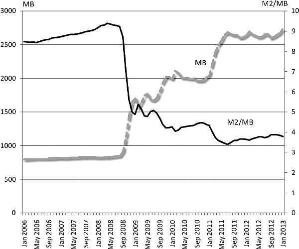 Кейнс назвал ситуацию, когда денежная эмиссия сопровождается падением цен (дефляцией), «ловушкой ликвидности». Она, в широком понимании, случается тогда, когда экономические субъекты направляют деньги не на рынок, а сохраняют их у себя. Таким образом, монетарное стимулирование рынка становится невозможным. Сторонники монетарной теории утверждают, что такой ситуации быть не может[198]. Однако США, как и Япония, все-таки попали (в очередную после 1929 г.) «ловушку ликвидности», когда, несмотря на расширение Монетарной базы в рамках программы спасения (bailout) и QE, предложение денег (М2) резко сократилось.