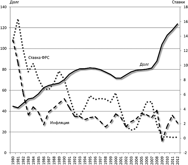 Финансовая модель экономики США: государственный долг, в % от ВВП, ставка ФРС и инфляция (1980–2012 гг.)[200]
