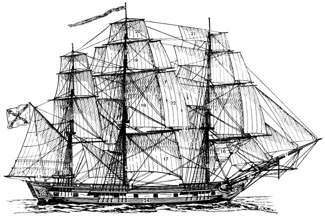 В выборе удобного для сего похода судна представилось немалое затруднение, ибо в императорском флоте не было ни одного судна, способного, по образу своего строения, поместить нужное количество провиантов и пресной воды сверх груза, назначенного к отправлению в Охотский порт, купить же такое судно в русских портах также было невозможно. Наконец сие затруднение уничтожилось прибытием в Петербург транспортных судов, построенных на реке Свире. По приказанию морского министра, управляющий Исполнительной экспедицией контр-адмирал[19] Мясоедов и корабельные мастера Мелехов и Курепанов свидетельствовали сии суда и нашли, что с большими поправками они могут быть приведены в состояние предпринять предназначенное путешествие; выбор пал на транспорт «Диану». Судно сие, длиною по гондеку 91 фут, по килю 802; ширина его 25, а глубина трюма 12 фут. Строено оно для перевозу лесов, и для того ширина к корме очень мало уменьшается, отчего кормовая часть слишком полна, следовательно, нельзя было в нем ожидать хорошего ходу; впрочем, во многих других отношениях касательно образа его строения казалось, что оно довольно было способно для предмета экспедиции. Что же принадлежит до крепости судна, то надобно сказать, что она не соответствовала столь дальнему и трудному плаванию: построено оно из соснового лесу и креплено железными болтами; в строении его были сделаны великие упущения, которые могли только произойти от двух соединенных причин: от незнания и нерадения мастера и от неискусства употребленных к строению мастеровых. Корабельные мастера Мелехов и Курепанов донесли министру, что судно требует больших исправлений, на окончание коих потребно времени около месяца.