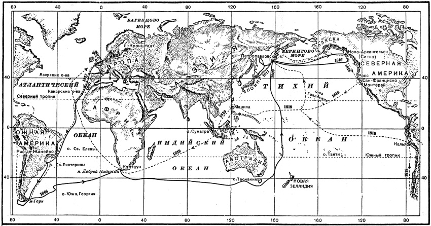 Государь император в 1816 году изволил высочайше утвердить доклад морского министра об отправлении одного военного судна в Северо-восточный океан1. При назначении сего путешествия правительство имело три предмета в виду: 1) доставить в Камчатку разные морские и военные снаряды и другие нужные для сей области и Охотского порта припасы и вещи, которые по отдаленности сих мест невозможно или крайне трудно перевезти туда сухим путем; 2) обозреть колонии Российско-Американской компании и исследовать поступки ее служителей в отношении к природным жителям областей, ею занимаемых, и, наконец, 3) определить географическое положение тех островов и мест российских владений, кои не были доселе определены астрономическими способами, а также посредством малых судов осмотреть и описать северо-западный берег Америки от широты 60° до широты 63°, к которому, по причине мелководия, капитан Кук2 не мог приблизиться.