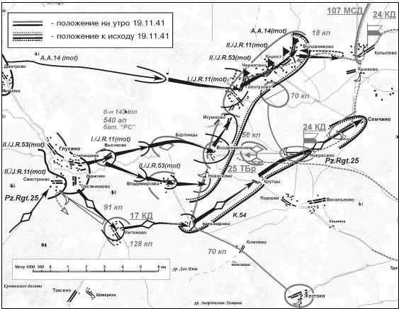 «В 15.30 19 ноября противник силой до полка мотопехоты, поддержанной 50 танками 6‐й танковой дивизии, прорвав оборону 107‐й мотострелковой дивизии, занял к 12.30 – Игумново, Воздвиженское, в 16.00 – Чернятино, Воловниково, к 17.00 – вышел на рубеж Копылово, Некрасино и далее на юг, создав угрозу захвата Ленинградского шоссе. Атака противника у Копылова была отбита нашими частями. Противник начал обходить деревню с юго-востока»[353].