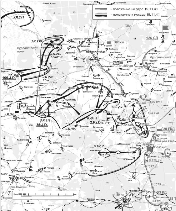 Зная положение перед участком полка Младенцева, мы можем уверенно говорить о том, что выполнение приказа Рокоссовского следовало бы начать сразу после его получения. Вряд ли командир курсантского полка знал состав наступавших против него частей противника, но что тот обладал «крупными силами» ему было наверняка известно. Однако полк остался на прежних позициях, скорее всего потому, что действовал в тот день не один. Судя по данным противника в районе Харланиха, Утишево, Поповкино, Буйгород оставались еще какие‐то подразделения 316‐й стрелковой, а также 17‐й, 24‐й и 44‐й кавалерийских дивизий. Кроме того, в списке потерь 58‐й танковой дивизии отмечено, что один танк был подорван 19 ноября в Утишево при отходе, еще один был взорван в Стромилово. В Теряевой Слободе также были потеряны в этот день три машины. Следовательно наличие танков в боевых порядках наших частей, о чем пишут немцы, не является выдумкой.