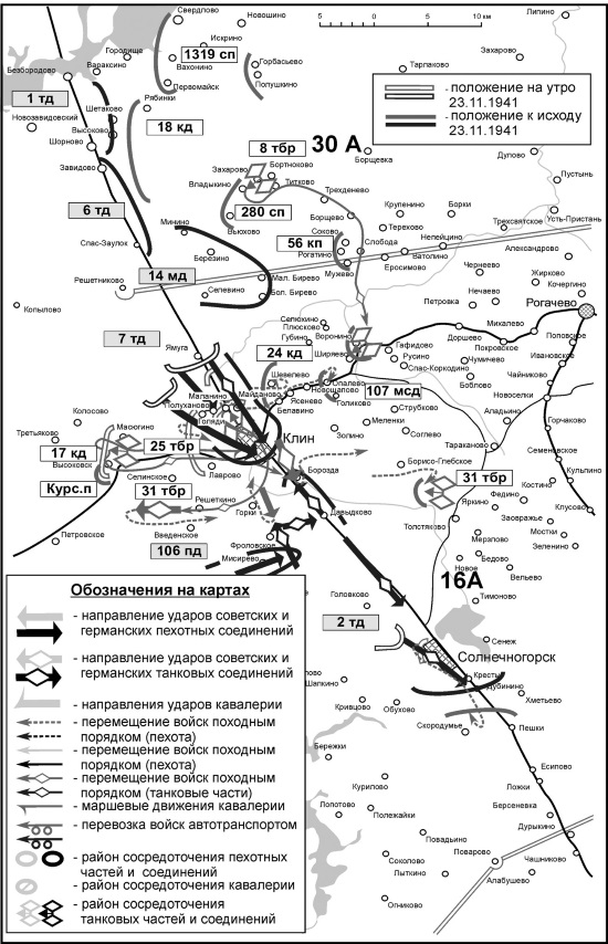 В тот же район начали отводиться и остальные соединения с левого фланга 30-й армии (107-я мед, часть сил 58-й тд и 24-й кд). Это отрицательно сказалось на состоянии обороны Клина, поскольку ослабило силы, прикрывавшие город с севера[23], откуда и последовал главный удар врага. Такие действия 30-й А диктовались теми задачами, которые перед ней ставил Генштаб. Да и формально за оборону города отвечала 16-я А. На генерала Захарова, помимо непосредственного руководства правофланговыми частями 16-й А, возлагалась еще и обеспечение стыка с 30-й А[24]. Он должен был непосредственно общаться с командиром ближайшего соединения 30-й А, но, судя по всему, никакого взаимодействия не получилось. В воспоминаниях Хетагурова нигде не говорится о встречах двух командиров групп с целью увязки действий. Он описывает беседу с Рокоссовским, но о войсках последнего ему ничего не известно[25]. На ком лежит вина за такое положение – неясно.