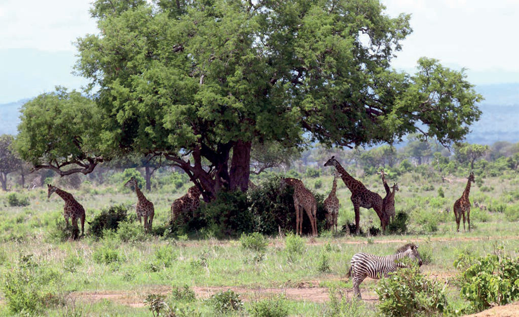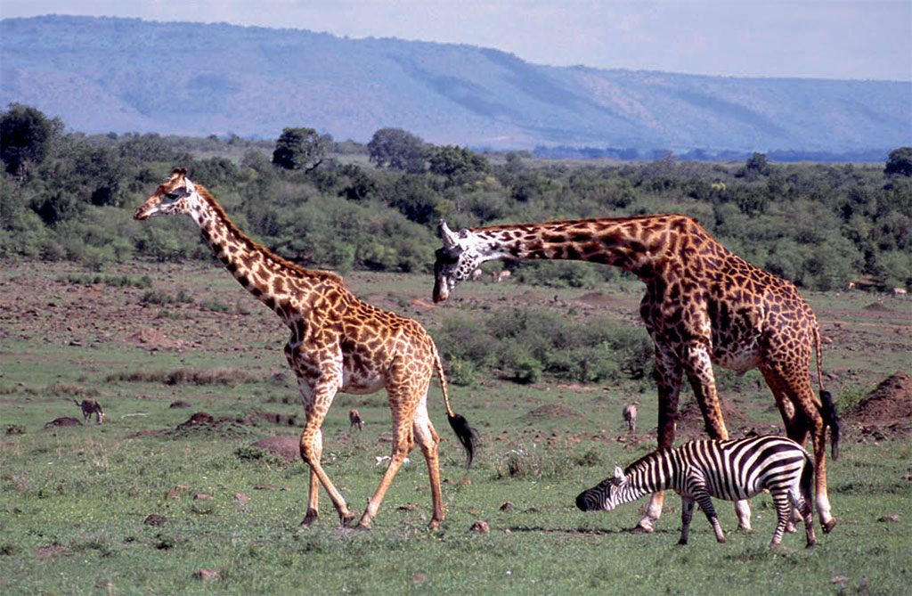 В небольшой акациевой рощице, что стояла на нашем пути, паслось около десятка масайских жирафов. Подобно экзотическим цветкам на длинных ножках они покачивали головками и переплывали от дерева к дереву, исследуя их зеленую крону. Тут же, рядом с ними, держался табунок саванновых зебр (зебр Гранта) и группа павианов – анубисов. Это вполне обычная картина для саванны. Сторожевые особенности жирафов, слонов или носорогов всегда использует кто-либо из их соседей – обезьяны, антилопы или зебры.