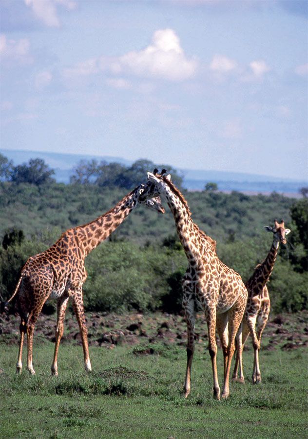 Мои личные ощущения при общении с жирафами подсказывают мне, что их основное мироощущение – это эгоцентризм великанов, смотрящих на наш мир сверху, как бы с колокольни. У них никогда нет проблем с питанием – везде, под любой акацией у них стол и дом, поэтому им не нужно захватывать пищевые территории. У них нет проблем с безопасностью – отличный обзор с высоты деревьев и отсутствие постоянных врагов (только лев и изредка леопард рискнут напасть на жирафа) позволяют жирафу жить спокойно и беззаботно. Тем более сегодня, когда количество львиных прайдов в саване уменьшается, камелопарды могут себе позволить помногу находиться поодиночке. Как правило, в мире животных любые социальные образования (стада, колонии) связаны с защитой от врагов (хищников, конкурентов), питанием и формами освоения территории. Красавцу-великану жирафу все это в целом не нужно, поэтому и связи между особями слабые и непрочные. Это заставляет молодняк быстро взрослеть и переходить к самостоятельной жизни. Но, тем не менее, инстинкты объединения с себе подобными живут в их генотипе и «тянут» друг к другу. Так образуются пары, группы и стада, но они быстро рассыпаются, не имея прочной функциональной основы.