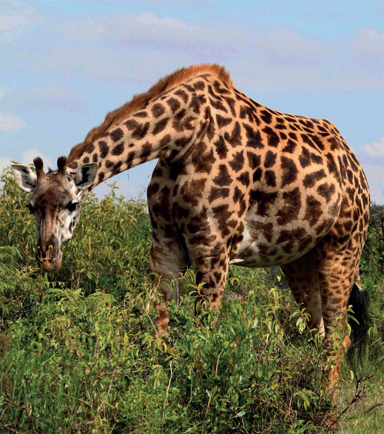 Нам, при поверхностном взгляде, кажется, что жираф кроме акаций не признает больше ничего. Но это не так. В Цаво подсчитали, что в жирафьем рационе присутствует около 70 видов растений. Ведь он объедает не только деревья, но и кустарник, а иногда не гнушается нагнуться и за травой. Как и при питье, он при этом расставляет ноги «циркулем». Но я подметил, что такой богатый рацион у жирафов может быть именно в Цаво, или в другом месте, где также превалирует буш (огромные, на десятки км заросли колючих кустарников) а не лес. В буше есть и деревья, но их запасов зелени не хватает жирафам на прокорм, поэтому они переходят на кустарник и даже траву саванны, как это делали наши знакомцы в Масаи Мара. В лесу же жирафы не нагибаются за травой, а потребляют запасы деревьев высоко над землей и изредка обращаются к кустарникам, поэтому их рацион в видовом составе резко уменьшается. Грустят ли по этому поводу сами жирафы, мы к сожалению не знаем.