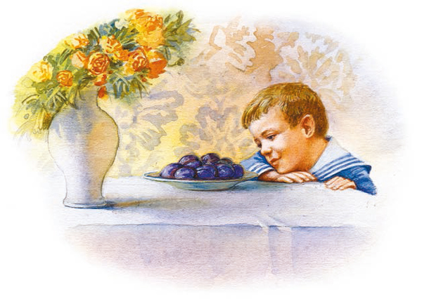 Купила мать слив и хотела их дать детям после обеда. Они ещё лежали на тарелке. Ваня никогда не ел слив и всё нюхал их. И очень они ему нравились. Очень хотелось съесть. Он всё ходил мимо слив. Когда никого не было в горнице, он не удержался, схватил одну сливу и съел. Перед обедом мать сочла сливы и видит – одной нет. Она сказала отцу.