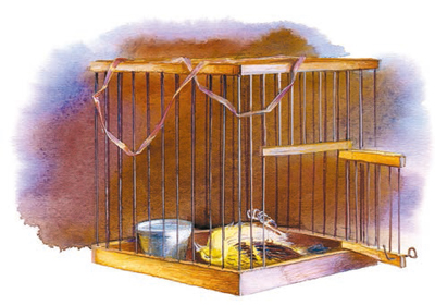 Сетка сделана так, что на рамке приделана дощечка и сетка откинута. Насы́пать семя на дощечку и выставить на двор. Прилетит птичка, сядет на дощечку, дощечка подвернётся, и сетка сама захлопнется.