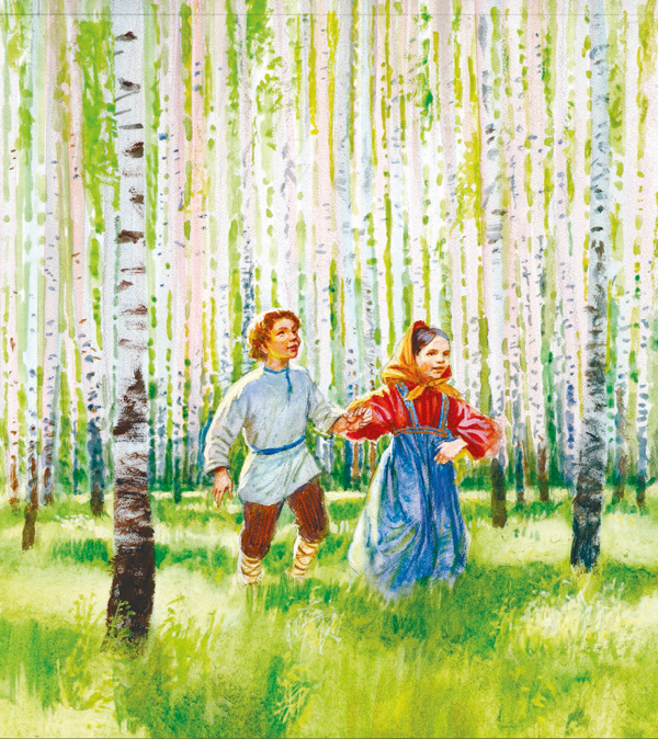 Сестре понравилось предложение брата. Дети бросили азбуки в траву, взялись за руки и скрылись между зелёными кустами, под кудрявыми берёзами. В роще точно было весело и шумно. Птички перепархивали беспрестанно, пели и кричали; белки прыгали по веткам; насекомые суетились в траве.