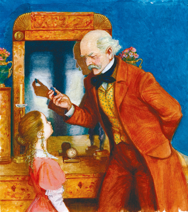 Между тем пришёл учитель. Лидинька должна была отереть слёзы и приняться за ученье, но она была очень грустна. Между тем рубль положила опять на то же место, где положил его дедушка.