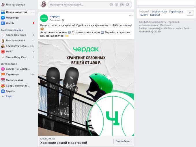 Я искал транспортную компанию для переезда, а в Фейсбуке* меня тут же нашел сервис по хранению вещей и доставке – весьма оперативно