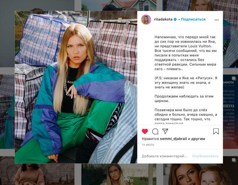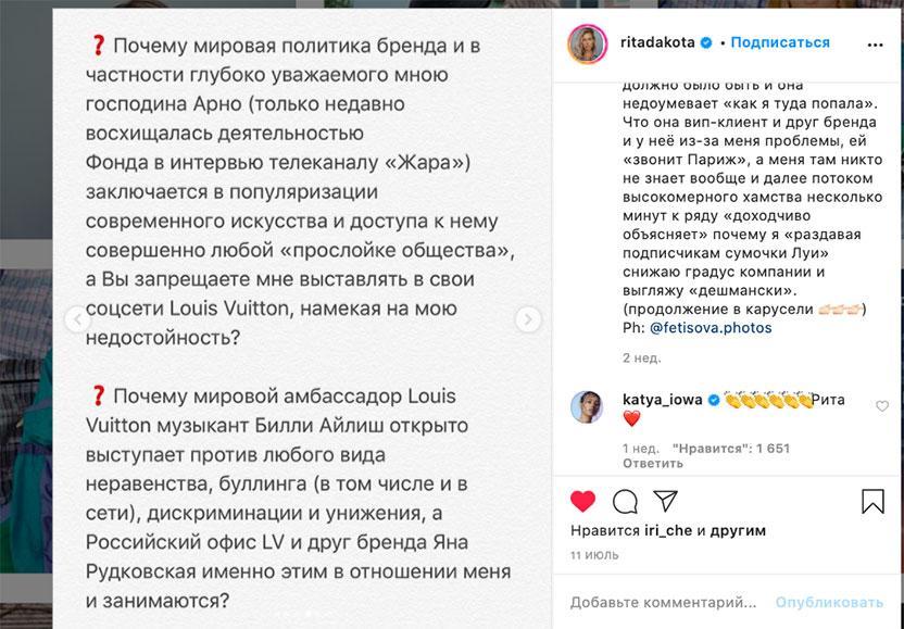 Певица пожаловалась на ужасное хамское поведение главной «амбассадорши» Louis Vuitton в России – госпожи Рудковской. В итоге более 20 000 гневных комментариев в аккаунте бренда. Некоторые возмущенные пользовательницы уже отказываются от приобретения сумок – Рита, например, сообщила, что свои отдала в детский дом.