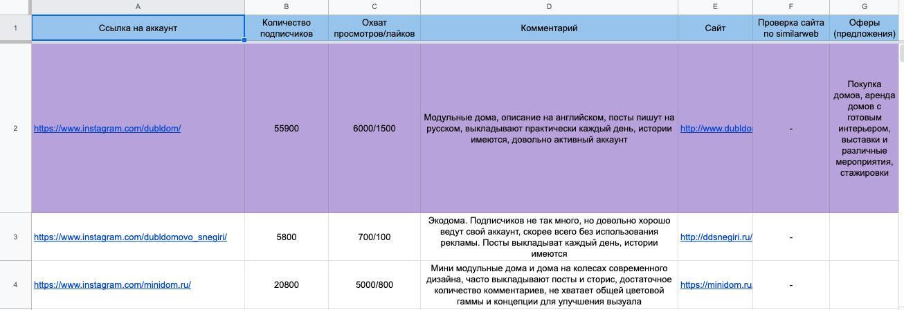 Пример таблицы для анализа конкурентных аккаунтов в Инстаграме*
