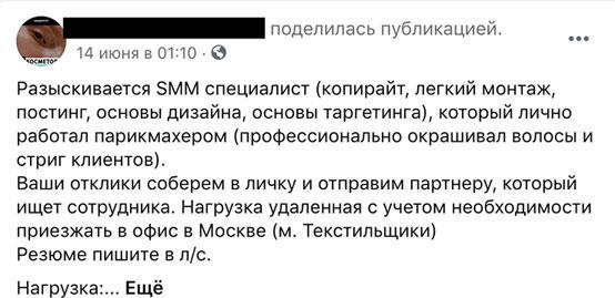 В этой вакансии требуется специалист с опытом работы в салонах красоты, но иногда встречаются вакансии вроде «ищем баристу, который будет варить кофе и вести соцсети»