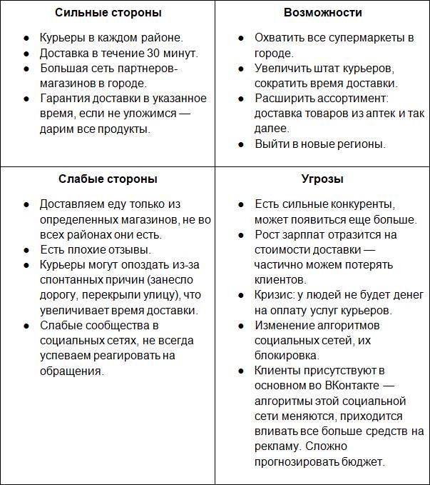 SWOT-анализ – это анализ бизнеса, его преимуществ, возможностей, слабостей и точек роста. Это поможет вам определить свое место на рынке, понять, чем конкуренты сильнее или слабее вас, прогнозировать изменения, которые могут повлиять на развитие бизнеса в социальных сетях.