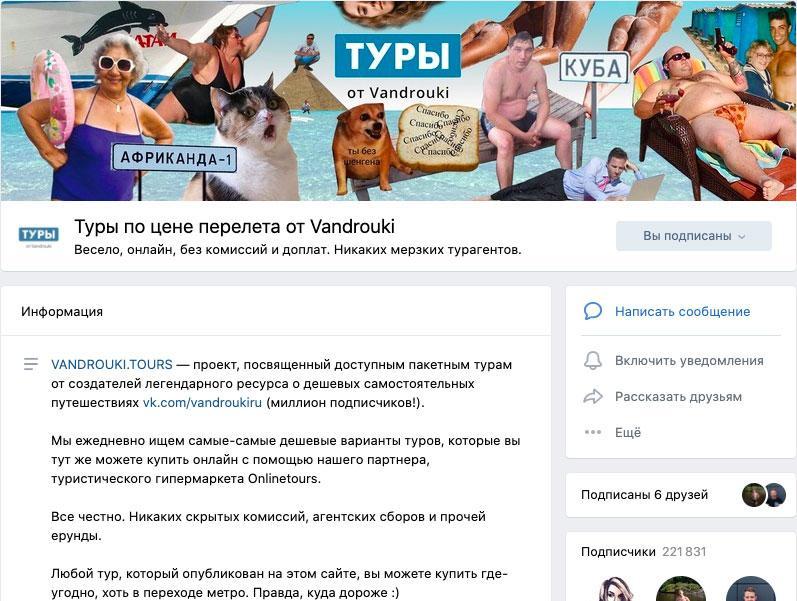 Группа во ВКонтакте с анонсами туров и скидок для путешественников, которые хотят сэкономить, стимулирует посещаемость основного ресурса VANDROUKI