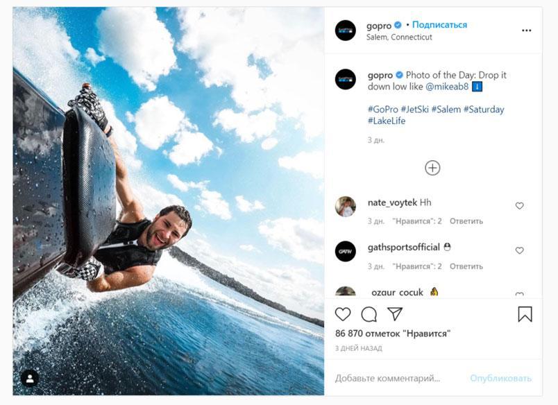 Пользовательский контент. Его еще называют UGC – User generated content. Это хороший тип контента, который показывает пользователям, что продукцией бренда пользуются люди. Отличный пример – инстаграм*-аккаунт производителя экшн-камер GoPro. Практически вся лента состоит из эффектных видео и фотографий, которые делают экстремальные спортсмены. Репосты таких кадров позволяют людям чувствовать себя частью чего-то большего.