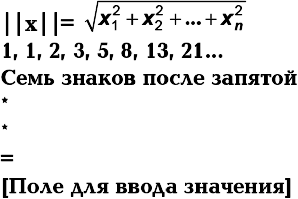 Поле для ввода. Едва я на него нажал, как перед глазами появилась виртуальная клавиатура, предлагающая ввести требуемое значение. Ввел пустую строку. Ничего не произошло. Ввел отдельно каждую надпись из фигурок. Результата не было. Потратил практически час на ввод их комбинаций. Ноль. Если судить по тексту, то нужно высчитать некое значение с точностью до семи знаков после запятой, но я абсолютно не видел логики в этих строчках.