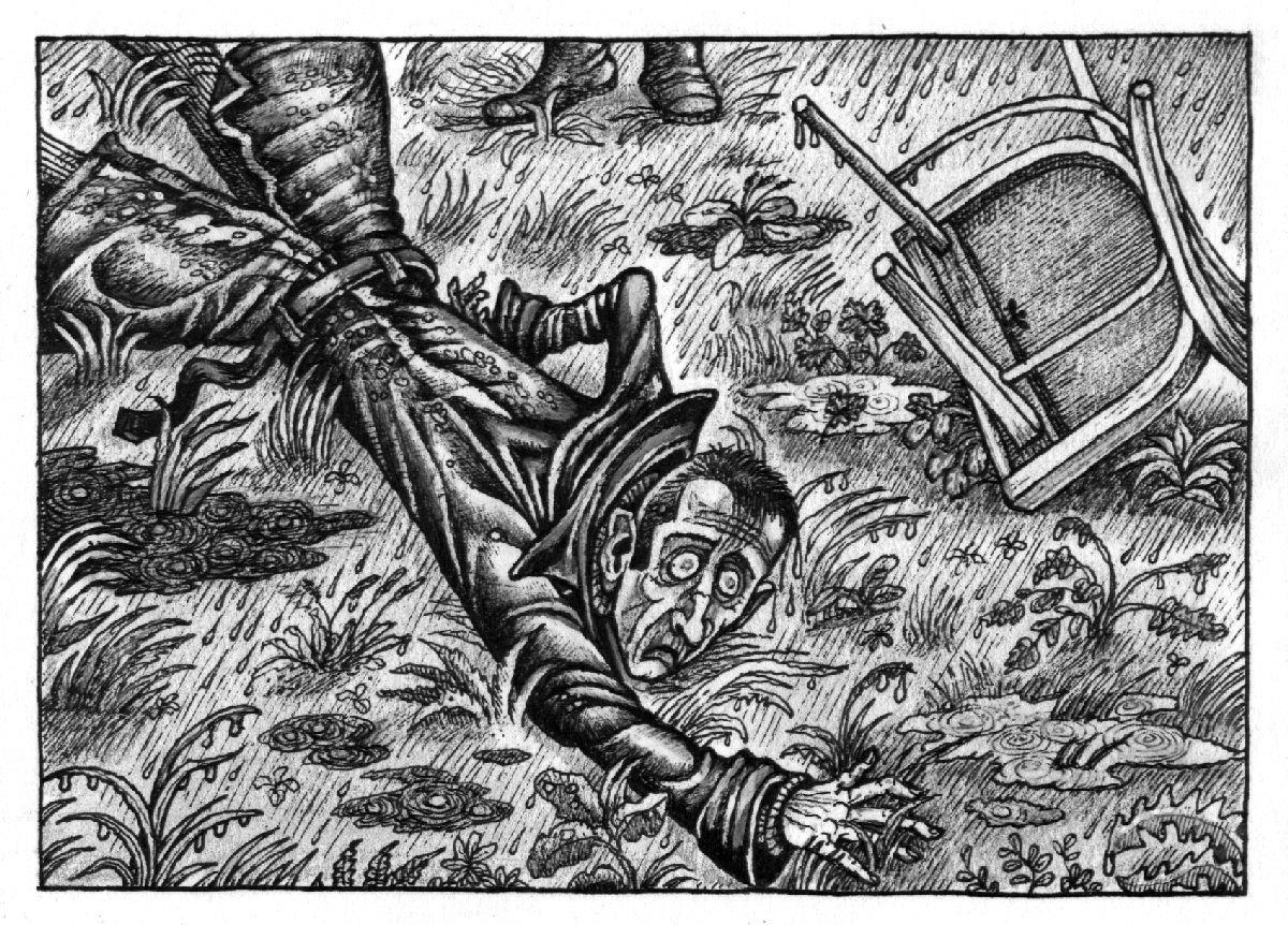 Опрокинутый стул, исхлестанный дождем, растопырил беспомощно ножки, а рядом в траве лежал человек, лежал лицом вниз, вытянув вперед руку, а другую подвернув под себя. Посиневшее лицо и широко раскрытые глаза с белесыми зрачками.