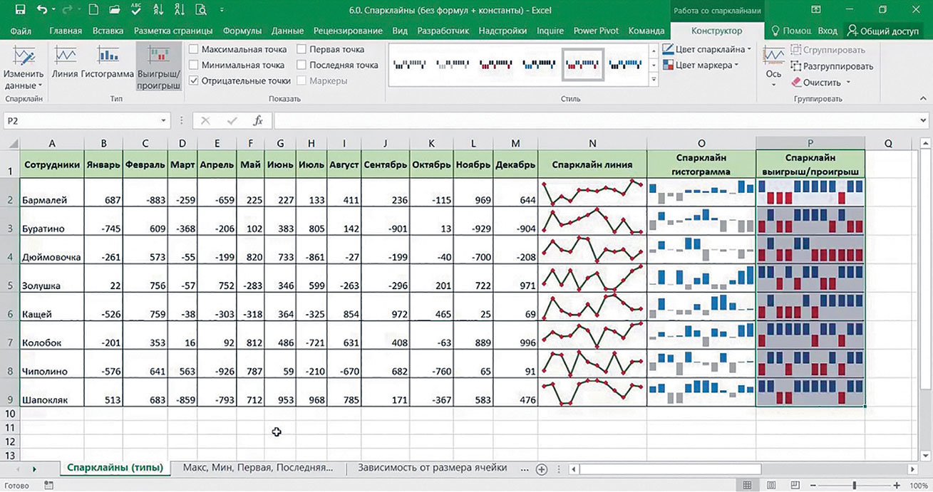 У того же Excel есть отличная функция, которой пользуются далеко не все. Эта функция позволяет разместить график буквально в одной ячейке, при этом, если залезть в настройки, там же можно и выделить минимальные и максимальные значения, вплоть до трендов. Эта функция называется спарклайн, и я очень рекомендую ее использовать буквально (действительно буквально) для каждого показателя.