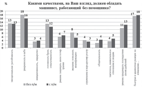В целом оценки, полученные от машинистов, схожи: основными качествами машиниста, работающего без помощника, признаны такие, как уверенность в себе, быстрая и адекватная реакция на изменения окружающей обстановки, эмоциональная устойчивость, готовность брать на себя ответственность, умение предвидеть последствия своих действий.