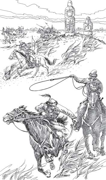 Тимофей уже высмотрел средних лет татарина в кояре – кожаном панцире, надетом под вывороченный мехом наружу бараний полушубок. Зло ощерившись, степняк выпустил несколько стрел, потом бросил лук и схватился за рукоять кривой сабли. Обнажить ее он не успел. Головин раскрутил длинный аркан, и петля захлестнула плечи ордынца. Резко развернув жеребца, Тимофей выдернул степняка из седла и поволок подальше от начавшейся рубки. Сзади звенели сабли, тревожно ржали лошади, яростно кричали люди, пластая друг друга клинками.