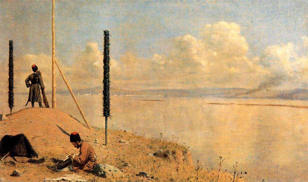 * * *Я написал этюд Дуная и одного из казацких пикетов на нем, но вообще работал красками немного; ездил в Журжево, ходил к казакам и иногда бродил смотреть работы минеров или ездил со Скрыдловым пробовать машину и ход его миноноски «Шутка». Чтобы опять-таки не обращать на себя внимания турок, надобно было ездить или с заходом солнца, или в дурную погоду и не дымить, не давать искр, для чего брался только лучший уголь, – турки не знали и не должны были знать о существовании у нас целой паровой флотилии.