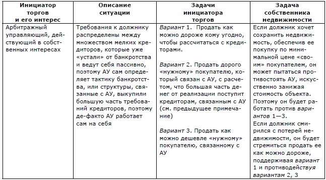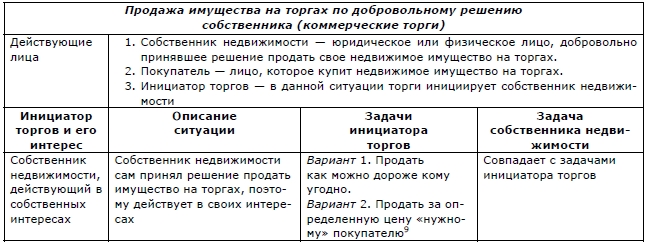 Таблица 2.4. Продажа имущества на торгах по добровольному решению собственника. Возможные интересы сторон