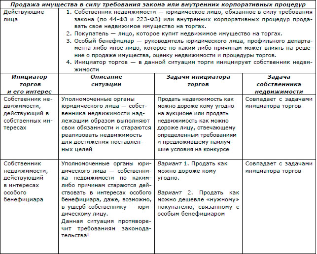 Таблица 2.3. Продажа имущества в силу требования закона или внутренних корпоративных процедур. Возможные интересы сторон