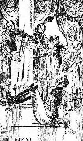 – Небось плясать не стану как Елисеич! – И градоначальник, придвинув кресло свое к усевшемуся Андрею Андреевичу, начал строить такие гримасы, от которых вся публика пришла просто в восторг. Тихон Парфеньевич вывертывал веки глаз, вытягивал уши, сплющивал нос, подносил носок ноги к подбородку и, натешившись досыта, уступил место свое другим лицам. Другие делали то же; девицы грациозно приседали, кавалеры шаркали; Петр Авдеевич, взяв палку, делал военный артикул, брал на плечо, на караул, и все, к удивлению зрителей, выделывал за ним Андрей Андреевич. За фантом Андрея Андреевича последовали другие фанты, другие фарсы и, наконец, фант Петра Авдеевича: ему приказано было выбрать из всех красавиц ту, которую сердце его избрало из среды всех, и вести ее за стол…