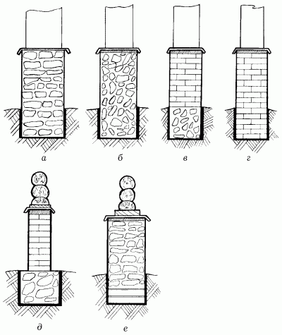Рис. 9. Фундаменты, сделанные из различных материалов: а – бутовый; б – бутобетонный; в – кирпичный с бутобетоном; г – кирпичный; д – кирпичный с бутом; е – бутовый на песчаной подушке.