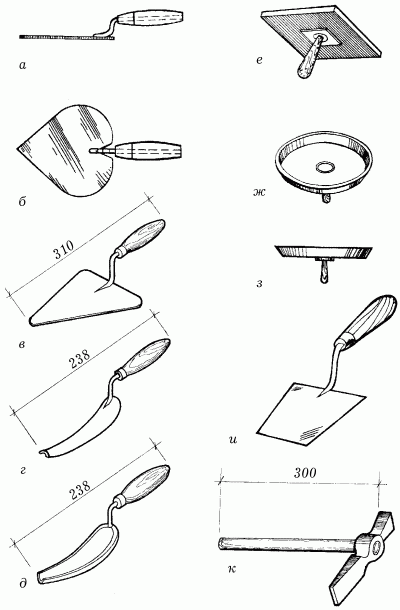 Рис. 10. Инструменты для кладки кирпича и оштукатуривания: а, б – мастерок штукатурный; в – мастерок строительный; г, д – расшивки; е – сокол для густого раствора; ж, з – сокол для жидкого раствора; и – кельма; к – молоток-кирочка.
