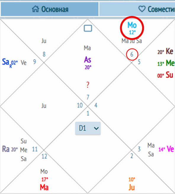 Построив карту, спуститесь до таблицы под натальной картой. В ней найдите Луну и её знак в колонке Раши. Колонка Навамша нас пока не интересует.