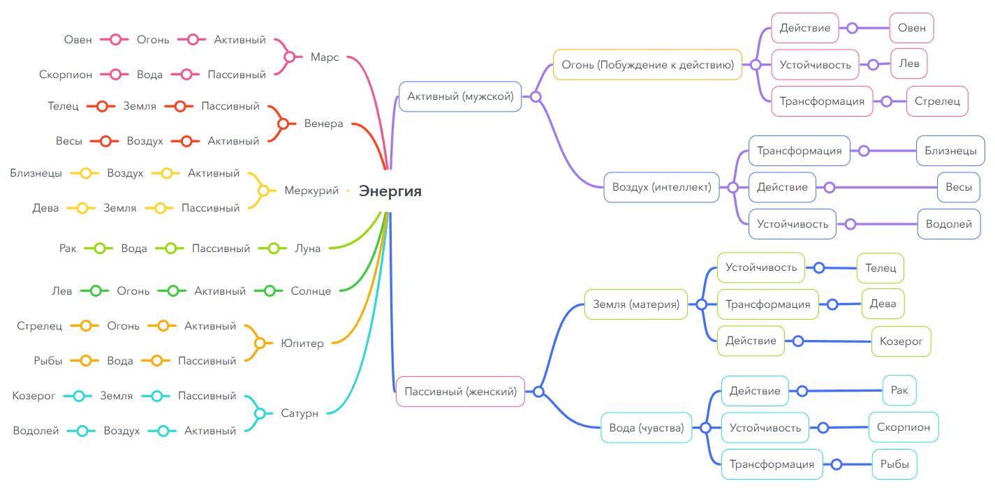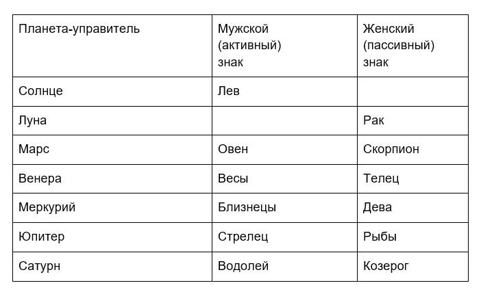 При этом каждая планета управляет одним мужским (активным), и одним женским (пассивным) знаком.