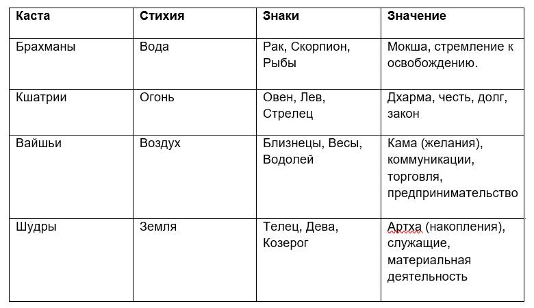 1. Смотрите, в каких знаках зодиака у вас находятся Лагна (восходящий знак), Лагнеш (управитель первого дома), Солнце и Луна. Это уже даст первое представление о преобладающей касте, если она есть.