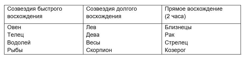На самом деле есть знаки, которые восходят долго. Например, знак Девы восходит 3 часа. И есть знаки, которые восходят быстро, около 50 минут (Водолей, Рыбы). А также есть знаки, которые действительно восходят около 2 часов.