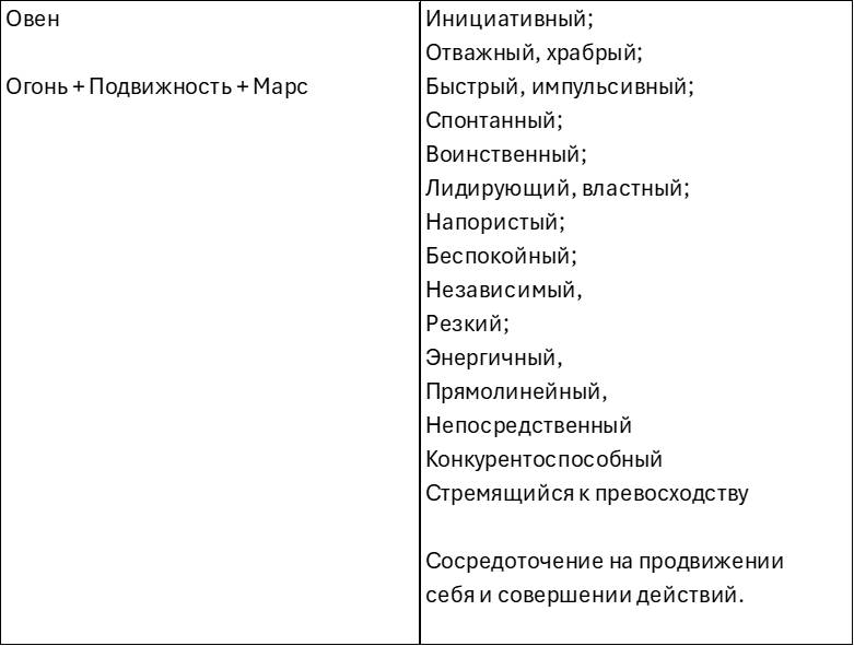 Активный принцип— первый элемент активного принципа (Огонь) – первое качество Огня (Воля) – Овен