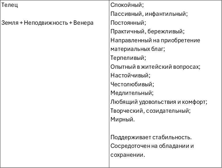 Знаки неподвижной триады дают склонность к стабильности и твёрдости. Они постоянны в своих привычках и привязанностях. Держатся за то, что у них есть. Будь то отношения, работа, материальные ценности или социальное положение.