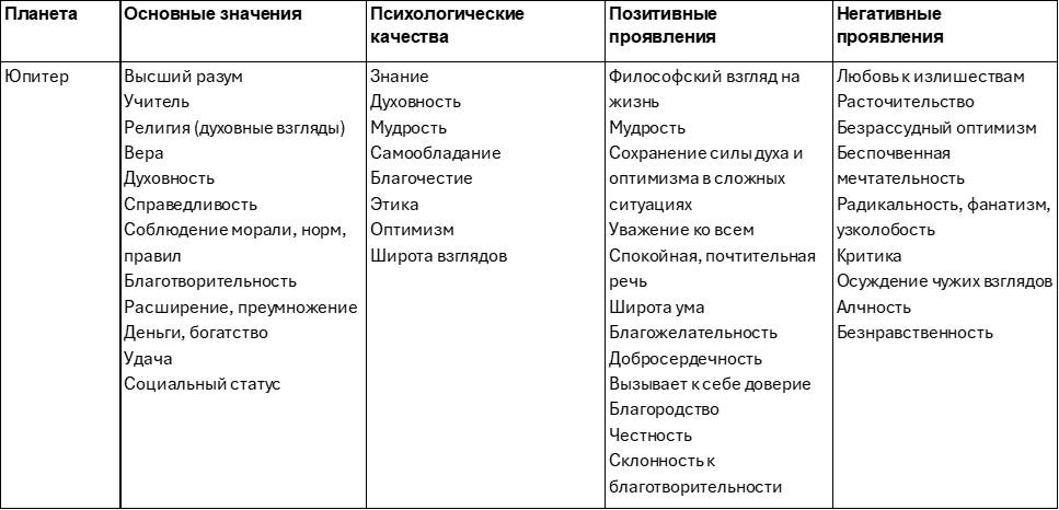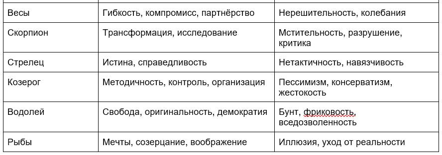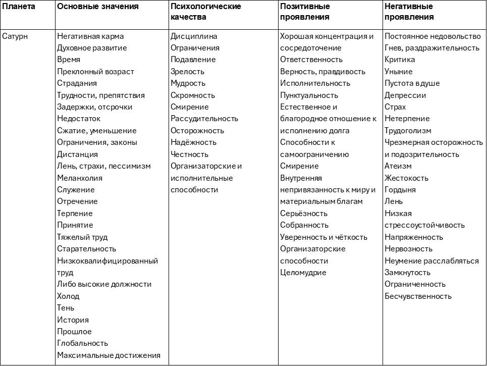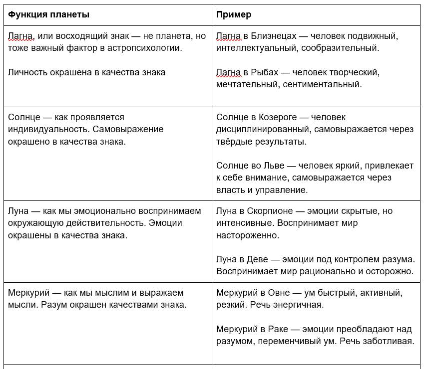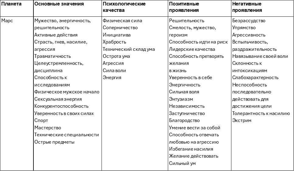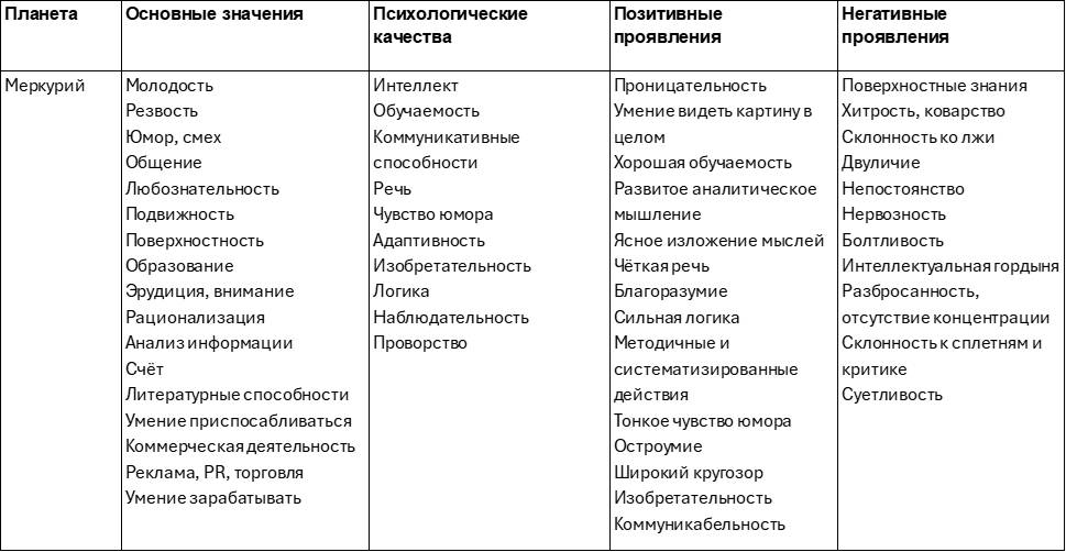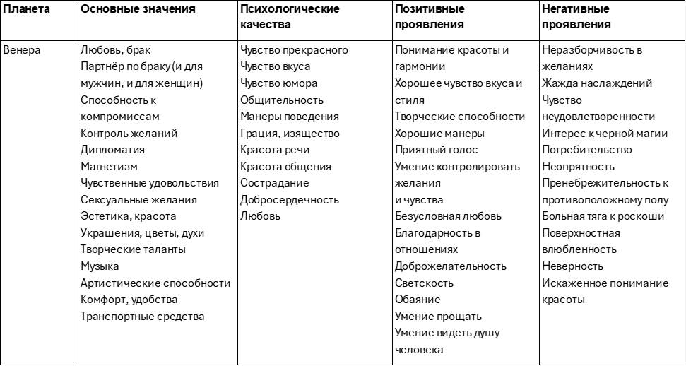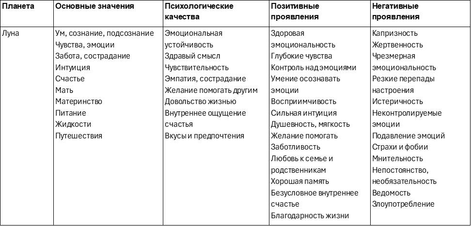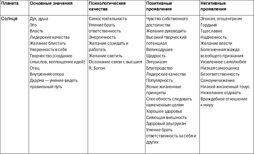 Эта таблица поможет лучше разобраться в свойствах и характере влияния планет. Качества планеты могут проявляться как с позитивной, так с негативной стороны, а также смешанно. Например, Луна может сделать человека заботливым, но мнительным. Меркурий – остроумным, но двуличным. Солнце – ответственным, но высокомерным.
