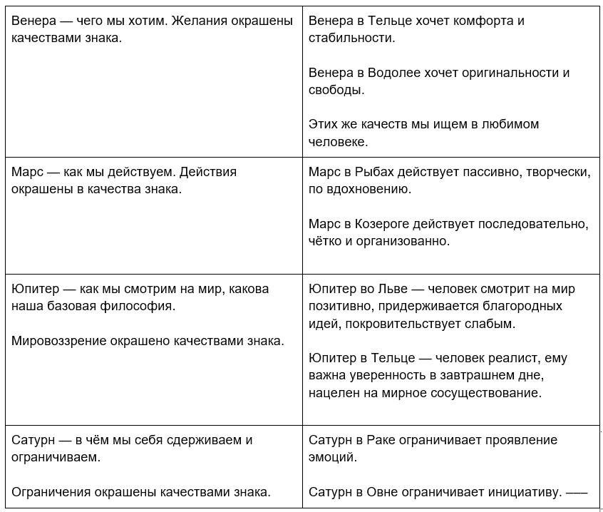 Другой пример. Венера – это желание, удовольствие. В мужском знаке Весов Венера олицетворяет удовольствие через воздушную стихию – коммуникации, партнёрство, интеллектуальное творчество. В женском знаке Тельца удовольствие доставляют земные, материальные энергии – финансы, тактильность, физический комфорт.