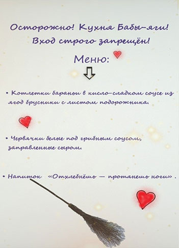 Довольная Велеслава подвела отца к закрытой двери в кухню, на которой крупными буквами было написано: «Осторожно! Кухня Бабы-яги! Вход строго запрещён!» Далее располагалось меню с вышеуказанными блюдами, сознательно украшенное сердечками, нарисованными красным фломастером на белой бумаге.