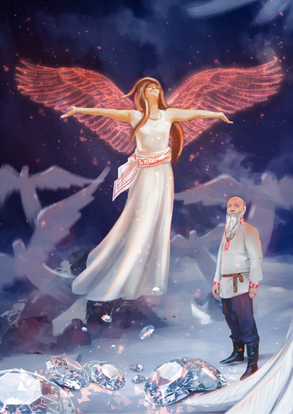 Ангелы подлетая к Велуше, приветствовали ее поднося свои дары, – это были крупные алмазные камни, острые грани которых от сильной дисперсии излучали ослепляющие блики света. Блики перекрещивались сияниям с мерцающей снежной пыльцой, поднявшейся в воздухе и ослепляли глаза стальным холодным блеском так сильно, что казалось, будто это диск туманной луны выкатился из за заснеженных вершин и засиял в ночном небе белым бриллиантовым солнцем.