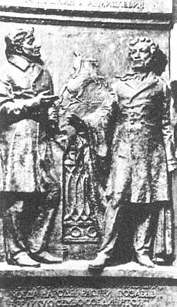 Мицкевич и Пушкин. Горельеф М. Мильбергера на фронтоне дома в Москве, где жил Мицкевич.
