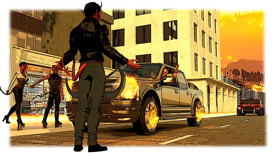 Сзади него пару раз пропиликали автомобили, но он врубил огненную аварийку, и колеса начали пылать в такт с ней. Водители стали проезжать мимо, но уже матеря этого наглого демона на автомобиле «HellCruser».