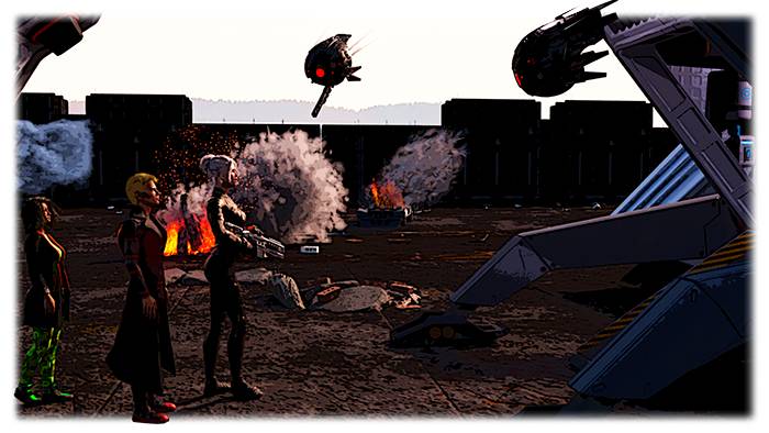 Дроп-джет приземлился в двадцати пяти метрах от нас. С заднего шлюза высыпалась толпа военных, а с нижнего отсека вылетели десяток боевых дронов в виде летающих окуляров с различными пушками.