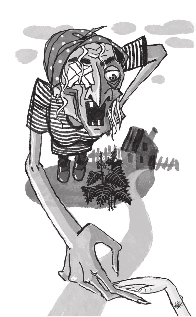 Прямо к ним, хромая на обе ноги, спешила безобразная старуха. В руке она держала веник, а её длинные седые патлы свисали до плеч. Один глаз ведьмы был заклеен пластырем, другой, выцветший от времени, бешено вращался.