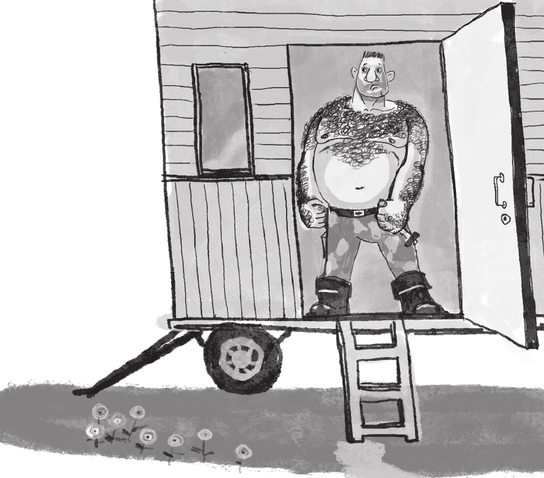 Жёлтое пластмассовое ведро валялось возле самой бытовки. Когда девочки двинулись в его сторону, дверь бытовки распахнулась – и оттуда вывалился огромный мужик. Полуголый – в одних камуфляжных штанах, – с необъятным пузом, весь покрытый густыми чёрными волосами, даже на спине. В руке он держал молоток.