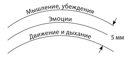 Верхний слой коры головного мозга отвечает за нашу интеллектуальную и мыслительную деятельность. Глубже располагается слой, связанный с переживанием эмоций. Более глубокие слои коры головного мозга активируются, когда мы двигаемся, дышим и говорим. Толщина этих трех слоев невелика, около 5 мм (Е. Зуев, «Волшебная сила растяжки»).