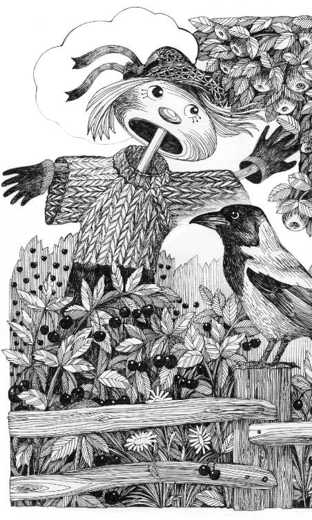 Подлетела она поближе, села на забор, за которым стояло Огородное Чучело, громко рассмеялась и начала его подразнивать: